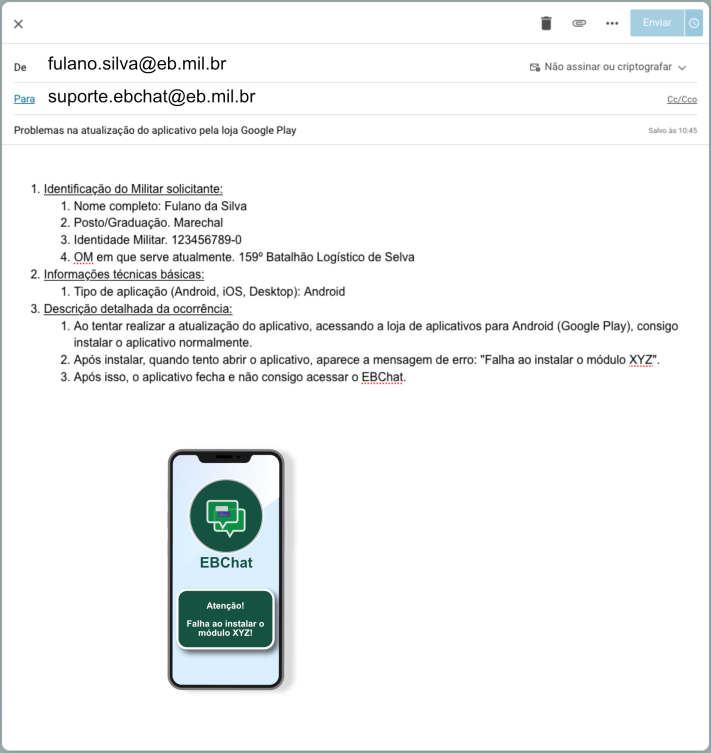 Todas as solicitações serão atendidas ÚNICA e EXCLUSIVAMENTE por intermédio do seguinte e-mail de suporte: ebchat@cds.eb.mil.br